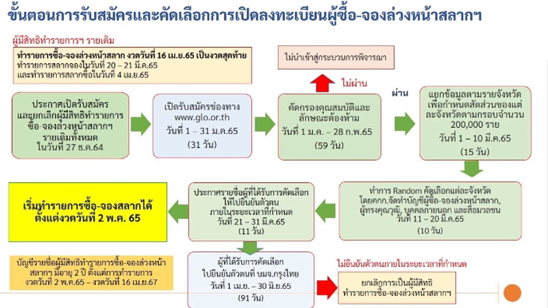 ลงทะเบียนผู้ค้าสลากรายใหม่ จำนวน 200,000 ราย เพื่อรับโควตาขาย “ลอตเตอรี่” สลาก 80 ในวันที่ 11 ส.ค. ก่อนเปิดให้ซื้อ-จอง ได้ ตั้งแต่งวด 16 ก.ย.2565 เป็นต้นไปผ่านระบบแอปพลิเคชั่น “เป๋าตัง” และ “ถุงเงิน” จะต้องมีการยืนยันจากประชาชนผู้ซื้อสลากว่าเป็นผู้จำหน่ายสลากจริงผ่าน QR Code อย่างน้อย 50 คนต่องวด และการจำหน่ายสลากผ่านแอปพลิเคชัน “เป๋าตัง” และ “ถุงเงิน” อย่างน้อยจำนวน 100 ใบต่องวด