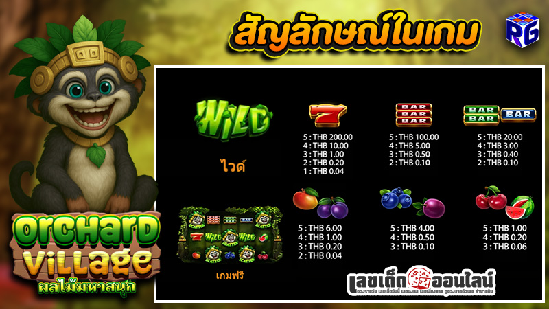 เกมสล็อต Orchard Village ผลไม้มหาสนุก ที่พาผู้เล่นเข้าสู่โลกแห่ง “หมู่บ้านผลไม้” ท่ามกลางธรรมชาติในชนบท ตัวเกมนำเสนอผ่านภาพกราฟิกแนวการ์ตูน สดใส น่ารัก พร้อมเสียงดนตรีแนวฟาร์มที่ชวนให้รู้สึกผ่อนคลาย เหมือนกำลังผจญภัยในสวนผลไม้แสนสนุก เกมสล็อตแบบ 5 รีล 3 แถว ทุกคนที่ได้เข้ามาเดิมพันสล็อตในค่าย RG SLOT เริ่มเบทเพียง 0.18 บาทเท่านั้น คุณก็จะได้รับประสบการณ์อันล้ำค่าในทุกๆช่วงเวลา เพราะในทุกๆช่วงเวลาที่เราได้เข้าไปปั่นสล็อต จะมีโบนัสเงินรางวัลเพิ่มเติม จะทำให้เราได้ประสบการณ์เพิ่มมากยิ่งขึ้น